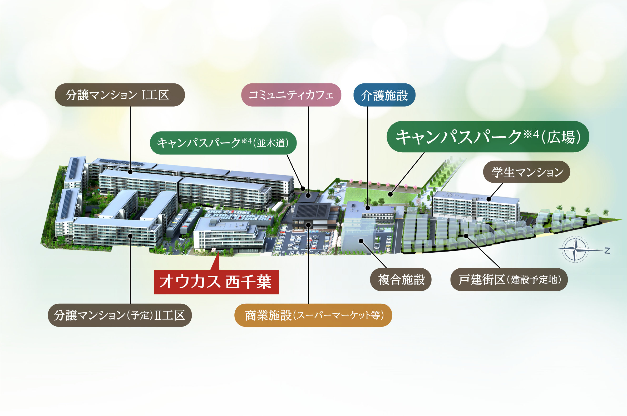 千葉 学美の杜については計画段階のものを表現したものであり、今後の行政指導等により変更となる場合がございます。商業施設・(仮称)西千葉キャンパスパークは2026年春開業・供用開始予定。学生マンション・介護施設は2027年春入居開始・開業予定。複合施設(2025年12月建築確認申請予定)は2027年春入居開始、戸建住宅(2026年4月建築確認申請予定)は2027年入居開始予定ですが、建物形状などは現在計画中の内容となり今後変更となる場合があります。分譲マンション(Ⅱ工区)(地上7階建・319戸)は入居時期未定。(建築確認を取得しておりますが、建築確認の計画変更を今後予定しており、その内容を一部反映しております。また現時点の情報であり今後変更になる場合があります。)(仮称)西千葉キャンパスパークは居住者専用の施設ではありません。運用開始時期については変更となる可能性がございます。居住者以外の第三者も利用します。また施設の運営は将来にわたって保証されるものではありません。ご利用の際は管理規約等に従っていただきます。