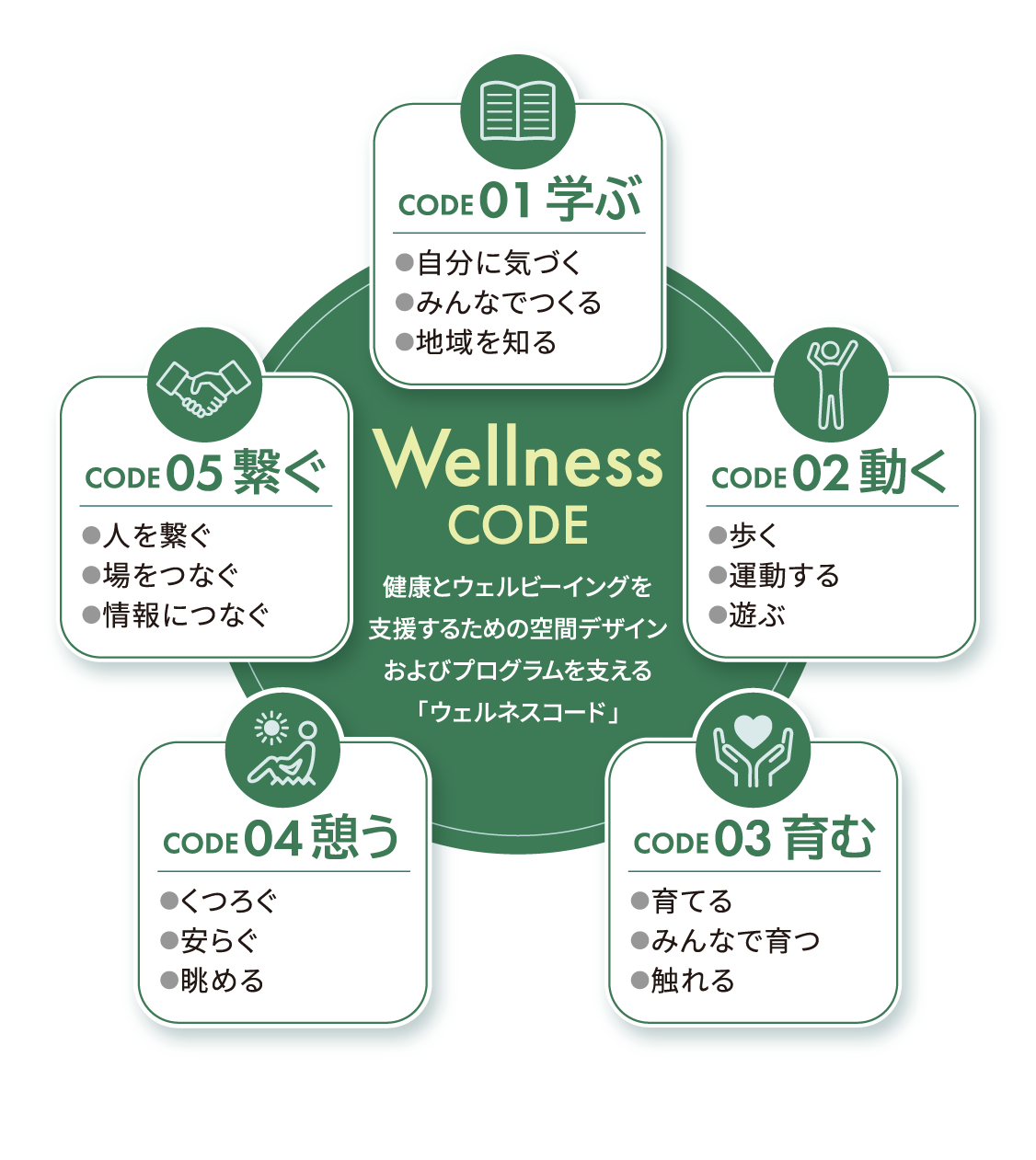 健康増進を観点とした5つのテーマのもと、ゼロ次予防に関する研究や事例を整理して街区の各所に取り入れ、健康増進が支援されるまちを目指します。